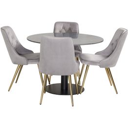 Razzia on moderni pyöreä ruokapöytä, jossa on kaunis terazzo-pinta ja mustasta metallista valmistettu runko. Vankka muotoilu yhdistyy siroihin muotoihin. Pöydän mukana toimitetaan neljä tyylikästä tuolia, jotka kruunaavat kokonaisuuden täydellisesti.
