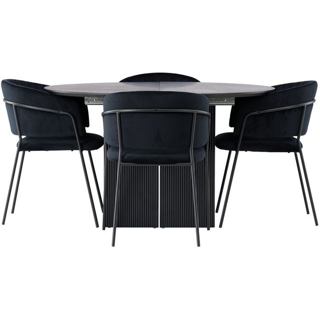 Tyylikäs ja käytännöllinen Matilda-ruokapöytä mukautuu tarpeisiisi! Tämä jatkettava ruokapöytä on varustettu mustalla, pyöreällä viilupintaisella pöytälevyllä ja tukevalla rungolla, jossa on kaksi palikkamaista jalkaa. Pöytä muuntuu käden käänteessä pidemmäksi, ovaalinmuotoiseksi ruokapöydäksi, kun ruokailijoita on enemmän. Kokonaisuuden kruunaa neljä Selma-tuolia, joissa on ajattoman tyylikäs muotoilu.