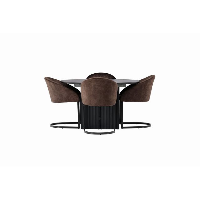 Tyylikäs ja käytännöllinen Matilda-ruokapöytä mukautuu tarpeisiisi! Tämä jatkettava ruokapöytä on varustettu mustalla, pyöreällä viilupintaisella pöytälevyllä ja tukevalla rungolla, jossa on kaksi palikkamaista jalkaa. Pöytä muuntuu käden käänteessä pidemmäksi, ovaalinmuotoiseksi ruokapöydäksi, kun ruokailijoita on enemmän. Kokonaisuuden kruunaa neljä Evening-tuolia, joissa on ajattoman tyylikäs muotoilu.
