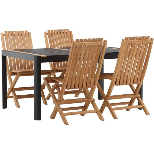Tämä ruokailuryhmä on yhtä näyttävä kuin kestäväkin! Togo-ruokapöydässä on suorakulmainen pöytälevy, joka yhdistää värillisen ja luonnollisen puun värisen tiikin. Alumiininen runko täydentää kokonaisuutta. Neljä kaunista ja mukavaa tuolia täydentävät kokonaisuuden täydellisesti!