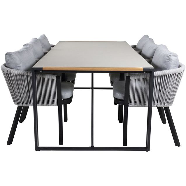 Kestävä ja tyylikäs ruokailuryhmä kuudelle! Texas-pöydässä on suorakulmainen spraystone-pöytälevy, jossa on koristeellinen tiikkireuna ja vahva, musta metallirunko. Kuusi mukavaa tuolia kruunaavat kokonaisuuden täydellisesti. Tämän ääreen kelpaa kutsua perhe ja ystävät viihtymään!