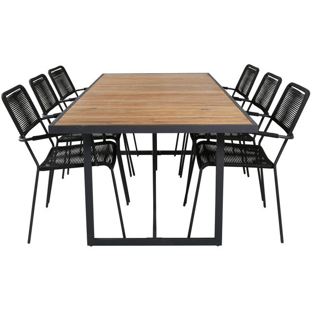 Ruokailuryhmä Venture Home, 200x100cm ruskea/musta Khung-pöytä + 6 mustaa Lindos-tuolia, käsinojilla