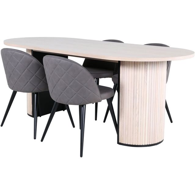 Soikea Bianca-ruokapöytä on modernisti muotoiltu, jykevä ja vakaa. Neljä tyylikästä Velvet Stitches -tuolia kruunaavat kokonaisuuden. Täydellinen ruokailuryhmä neljälle!