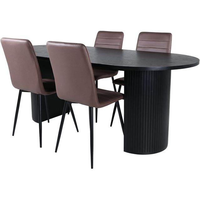 Soikea Bianca-ruokapöytä on modernisti muotoiltu, jykevä ja vakaa. Neljä tyylikästä Windu Lyx -tuolia kruunaavat kokonaisuuden. Täydellinen ruokailuryhmä neljälle!