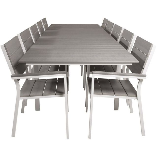 Ruokailuryhmä Venture Home, 229/310x100cm jatkettava harmaa/valkoinen Levels-pöytä + 10 harmaa/valkoista, pinottavaa Levels-tuolia