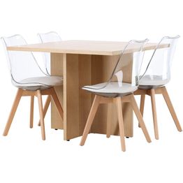 - Värin tarkenne: Valkoinen pöytä, jossa on puun sävyiset jalat, tuoleissa läpinäkyvä selkänoja ja valkoinen pehmuste