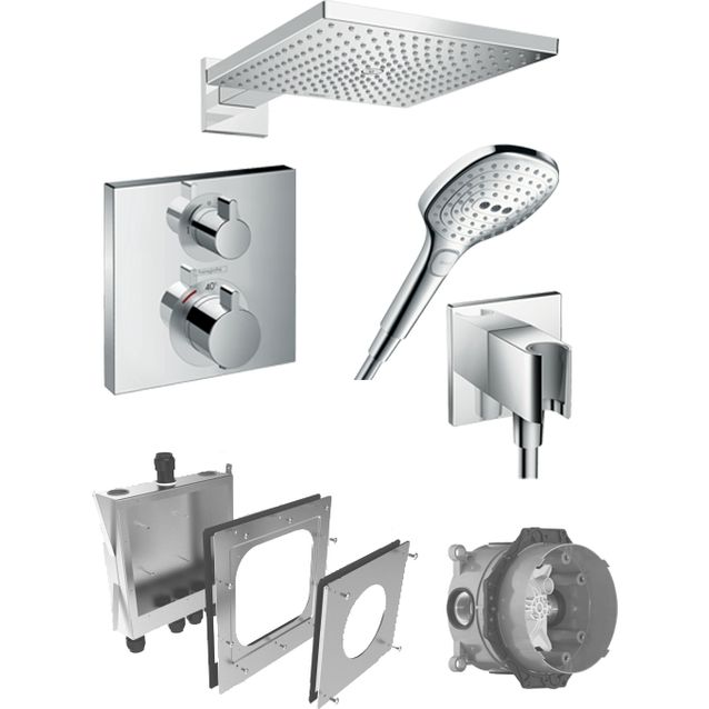 - Toimitussisältö: Uppoasennuskotelo Joramark 30010, runko-osa Hansgrohe iBox Universal DN20, termostaatti Hansgrohe ShowerSelect, yläsuihku Hansgrohe Raindance E 300 Air 1jet seinäsuihkuputkella, käsisuihku Hansgrohe Raindance Select E 120 3jet, seinäliitin FixFit Porter suihkupidikkeellä, suihkuletku Hansgrohe Isiflex
