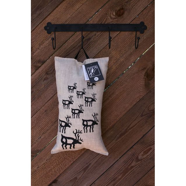 Käsinpainettu ja pellavasta valmistettu Pikkupuodin saunatyyny Porot-kuosilla. Pellavanvärisen tyynyn kangas on pehmeää ja miellyttävän tuntuista. Saunatyyny sisältää antibakteerisesti käsiteltyä styroksirouhetta, joka ei ominaisuutensa vuoksi homehdu kastuessaan. Käytetyt painovärit ovat myrkyttömiä, ja tyyny kestää konepesun.
