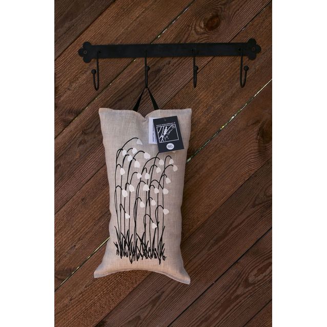Käsinpainettu, pellavasta valmistettu Pikkupuodin saunatyyny Suovilla-kuosilla. Pellavanvärisen tyynyn kangas on pehmeää ja miellyttävän tuntuista. Saunatyyny sisältää antibakteerisesti käsiteltyä styroksirouhetta, joka ei homehdu kastuessaan. Käytetyt painovärit ovat myrkyttömiä, ja tyyny kestää konepesun.