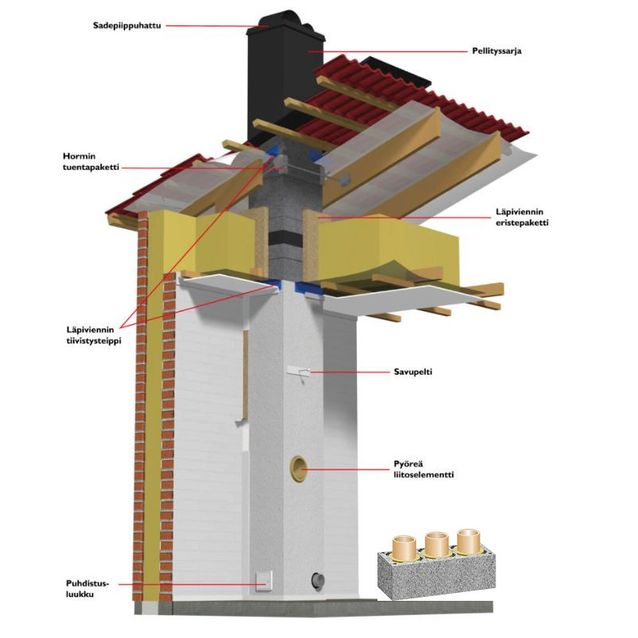 - Läpiviennin eriste. Halutessasi voit ottaa piipun mukaan yläpohjan läpiviennin eristeet, joiden lämpötilaluokka on T600. Selvitä tulisijan lämpötilaluokka - piipun ja tiivistyspaketin luokan on oltava sama tai korkeampi. Kiukaaseen liitettävän piipun luokka on oltava T600.