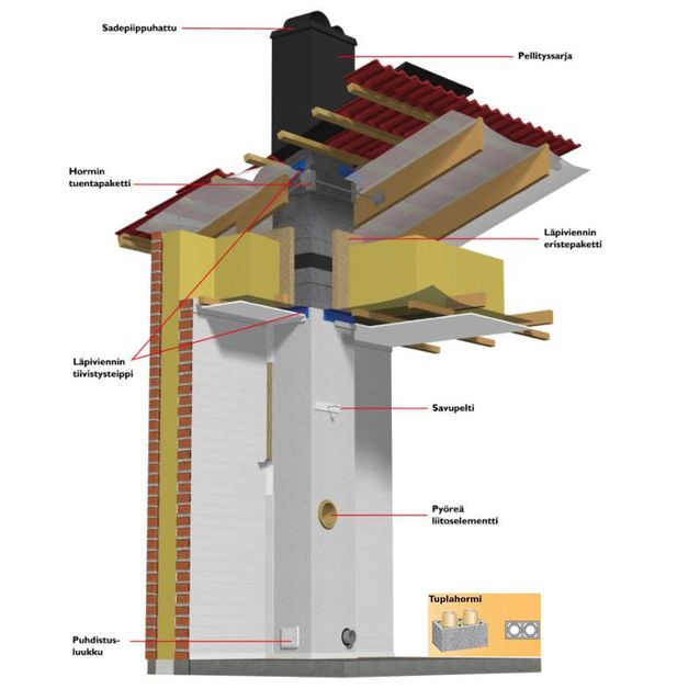 - Läpiviennin eriste. Halutessasi voit ottaa piipun mukaan yläpohjan läpiviennin eristeet, jonka lämpötilaluokka on T600. Selvitä tulisijan lämpötilaluokka - piipun ja tiivistyspaketin luokan on oltava sama tai korkeampi. Kiukaaseen liitettävän piipun luokka on oltava T600.