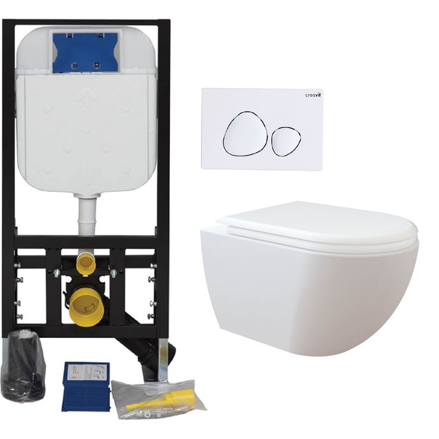 - Toimitussisältö: Settiin kuuluu WC-istuin Creavit Free Rimless, soft-close kansi, seinä-WC-elementti Creavit GR5003 ja huuhtelupainike Creavit TERRA. Toimitus sisältää kaikki kiinnikkeet ja liittimet.