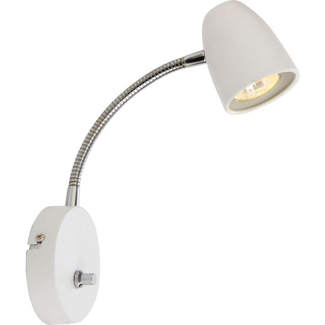 Aneta Lightingin valkoinen seinävalaisin Sandnes on perusseinävalaisin suunnattavalla flex-varrella mattavalkoisen sekä kirkkaan kromin yhdistelmänä. Toimitus ei sisällä (max 6 W GU10) lamppua. Valaisin sisältää portaattoman himmentimen seinälevyssä, joten valaisimessa tulee olla myös himmennettävä lamppu. Valaisimessa on 240 cm pitkä johto.