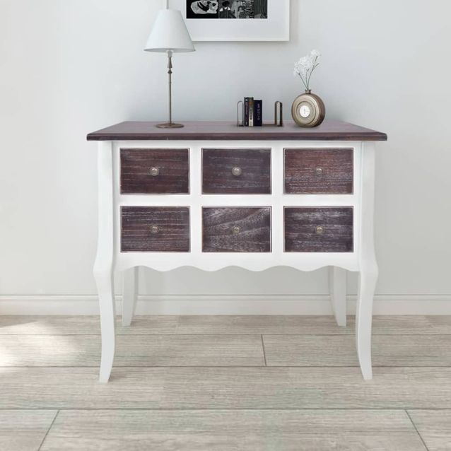 Sivukaappi 6 vetolaatikolla ruskea ja valkoinen puu