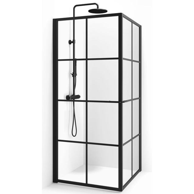 Ruudukollinen Macro Design Empire -suihkunurkka koostuu kahdesta kääntyvästä nostosaranalla varustetusta ovesta. Kirkas lasi on 6 mm vahvuista ja sopii erinomaisesti yhteen mattamustien alumiiniprofiilien kanssa. Tuote on helppo pitää puhtaana, sillä ruudukko on suihkun ulkopuolella ja irroitettavissa puhdistuksen ajaksi. Ovet avautuvat molempiin suuntiin 90 astetta ja niissä on tyylikkäät nuppivetimet. Magneetti ja laahustiivisteet takaavat tiiviyden. 30 mm putken läpivienti mahdollinen. Korkeus 201 cm.