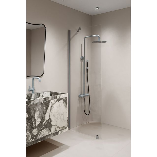 Hietakarin kirkaslasinen suihkuseinä Forma 301 on harmailla profiileilla varustettu suihkuseinä, joka valmistetaan omia mittojesi mukaisesti. Geometrisesti muotoiltu suihkuseinä on helppo ja tyylikäs tapa erottaa suihkutila muusta kylpyhuoneesta ja varmistaa, etteivät suihkuvedet roisku minne sattuu. Karkaistusta turvalasista valmistettu seinä on saatavilla mittatilaustuotteena, joten voit valita omaan kylpyhuoneeseesi juuri sopivan koon. Kiinteän seinän alareunassa on työstettävä sokkelitiiviste.