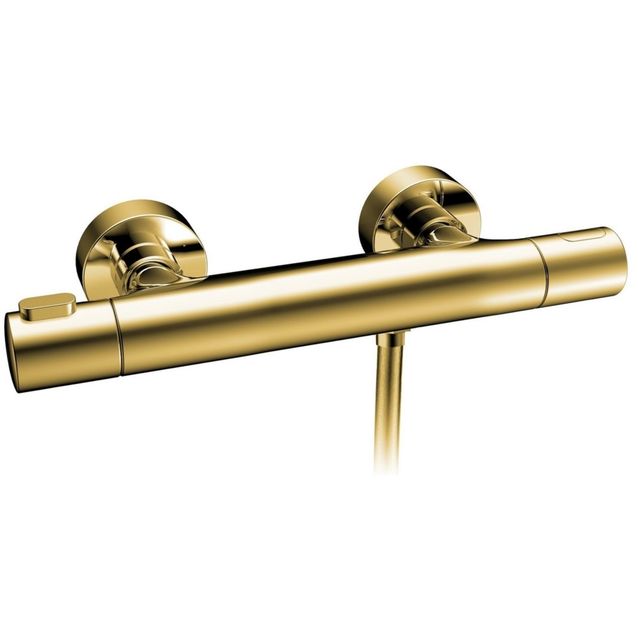 Messingin värisessä suihkutermostaatti Bathlife Brusassa on menneiden aikojen taikaa. Bathlife Brusa on näppärä suihkusekoittaja, jossa on ergonomiset ja helppokäyttöiset säätimet. Väriltään messinkinen sekoittaja sopii perinteisiin kuin moderneihinkin kylpyhuoneisiin. Termostaatti on helppo sijoittaa minne tahansa kylpyhuoneessa klassisen muotoilunsa ansiosta ja suihkukiinnitys on termostaatin alapuolella.
