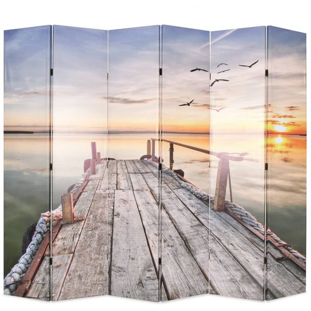 Suojasermissä on kestävällä kankaalla päällystetty puinen runko. Sen molemmilla puolilla on kuva auringonlaskusta järvellä ja se luo täten rauhallisen tunnelman huoneeseesi. Huoneenjakaja voidaan taittaa helposti kokoon, jotta säästät tilaa silloin, kun sitä ei käytetä.