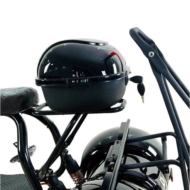 Sähköskootterin lukittava takaboksi tarjoaa kätevää kuljetustilaa. Yhteensopiva kolmipyöräisen Kontio Kruiser Trike sähköskootterin kanssa.
