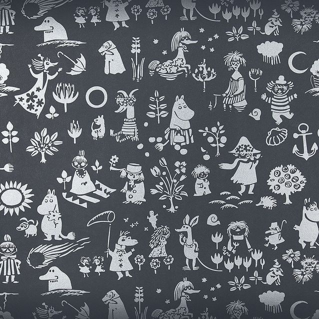 Sandudd Moomin 5164-1 on kuitutapetti, jossa rakastetut ja ajattomat Muumi-hahmot seikkailevat hopeisina mustalla pohjalla. Eloisa ja tuttu kuvitus yhdistettynä moderniin tyyliin miellyttää niin lapsen kuin aikuisenkin silmää. Kuviollinen tapetti raikastaa sisustusta ja sopii yhteen myös muiden Sandudd Moomin -malliston tapettien kanssa.