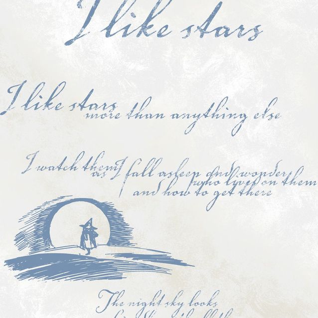 Kauniissa Sandudd Muumi 5349-3 -kuitutapetissa on Nuuskamuikkunen ja siniset mietelauseet kauniisti sommiteltuna vaalealle pohjalle. Hillitty tekstitapetti sopii loistavasti myös aikuiseen makuun.