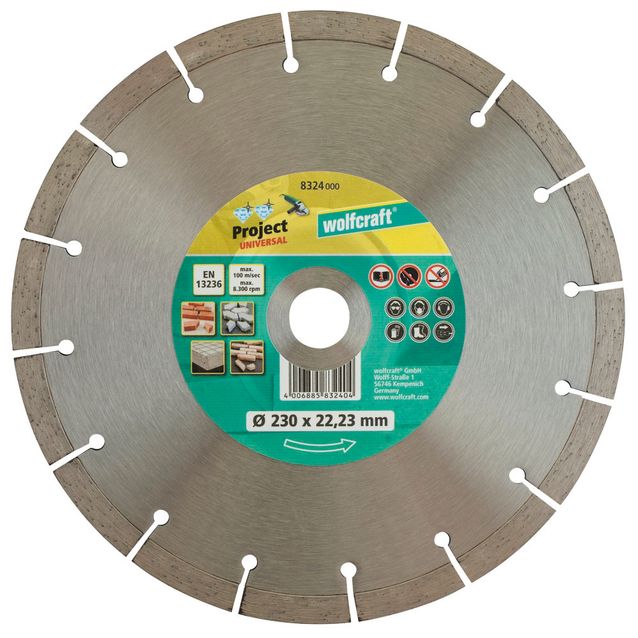 Erinomaisen leikkuujäljen Wolfcraft timanttilaikka Pro Universal 230 mm. Soveltuu kulmahiomakoneille.