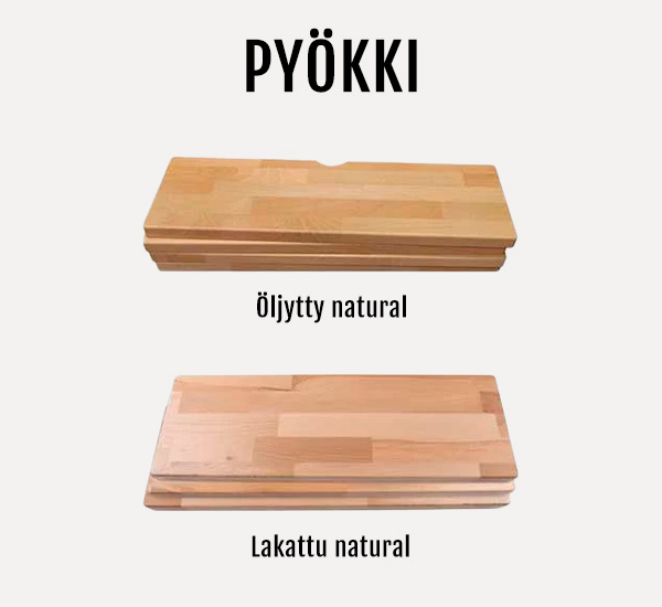 Dolle-portaiden pyökki on niin ikään eurooppalaista ja FSC®-sertifioitua. Öljytty pinta suojaa puuta tehokkaasti vedeltä ja tahroilta. Pinta on öljytyssä pintakäsittelyssä sileä ja silkinomainen. Lakattu pinta tekee askelmista puolikiiltävät, erittäin kestävät ja naarmuuntumattomat.