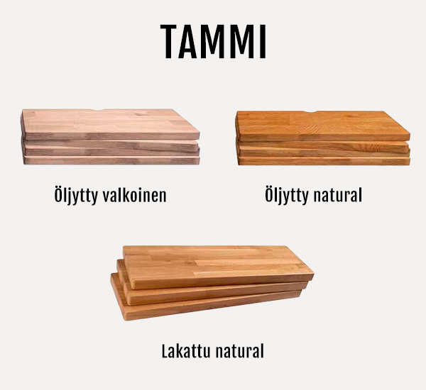 Öljy suojaa puun pintaa, ja pinta kestää paremmin vettä ja tahroja. Öljy imeytyy puuhun muodostaen sileän ja lähes silkkisen pinnan, jossa puun rakenne näkyy ja tuntuu. Lakattu pinta on erittäin kestävä, naarmuuntumaton ja helppohoitoinen puolikiiltävällä lopputuloksella. Dollen tuotteissa käytetty tammi on aina eurooppalaisista FSC®-sertifioiduista metsistä.