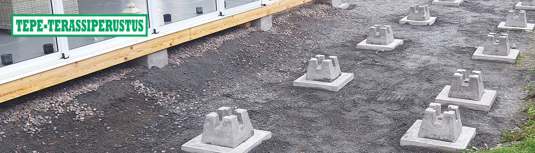 Muunneltavat TEPE-terassiperustuskivet ovat helpompi vaihtoehto terassien ja piharakennusten perustamiseen vaihtelevassakin maaperässä. TEPE-korokekivillä voit säädellä perustuksen korkeutta kätevästi maaston muotoja mukaillen. TEPE-pilarikiven muotoilun vuoksi et enää tarvitse erillisiä pilari- tai palkkikenkiä, vaan kannakelankut ja pystytolpat ovat valmiiksi yhteensopivia TEPE-pilarikiviin.