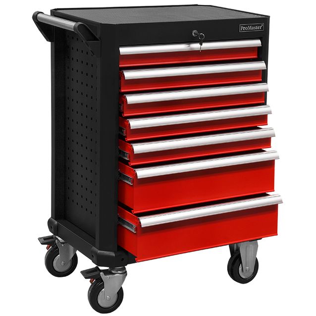 ProMasterin työkaluvaunu, jossa on seitsemän lukittavaa laatikkoa. Vaunussa on kaksi kiinteää ja kaksi kääntyvää, lukittavaa pyörää. Vaunu on valmistettu pulverimaalatusta pellistä. Paino 70 kg. Huomioithan, että vaunu ei sisällä työkaluja.