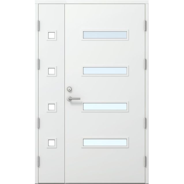 Kaskipuun lasiaukollinen ulko-ovi FE3 ja levike VLA1/VLK1 M3 tuovat modernia ilmettä ja valoisuutta sisäänkäyntiin. Ovessa ja levikkeessä on neljä vaakasuuntaista lasiaukkoa, pinta on molemmin puolin sileä. Valitse oven viereen joko omaan karmiin tuleva kiinteä levike VLK1 Thermo tai avattava VLA1 Thermo -levike, joka tulee aina oven lukkopuolelle ja samaan karmiin oven kanssa. M3 tarkoittaa levikkeen moduulileveyttä, joka on 290 mm ja pysyy aina samana riippumatta oven ja levikkeen kokonaisleveydestä. Kokonaisleveyden muuttuessa vain oven leveys muuttuu. U-arvo ovella ja levikkeellä on 1.0.