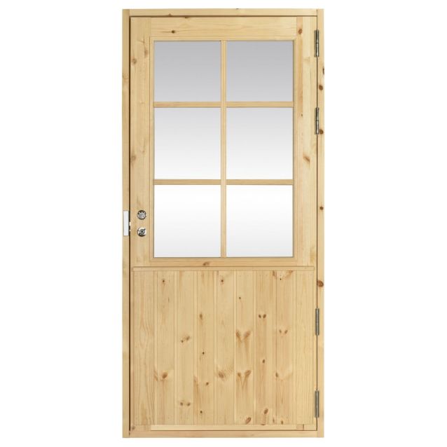 Kaskipuun UL7A perinteinen huvilan ovi varustettuna lasiaukolla ja kuusiruutuisella ristikolla. Molemminpuolinen pystypanelointi 95 mm:n terveoksaisella mäntypaneelilla. Ovi sopii hyvän lämmöneristävyytensä vuoksi hyvin myös taloihin.