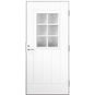 Valkoinen Oulux 6R ulko-ovi on linjakas perusovi 115 mm leveällä karmilla. Kuusiosaisella ristikolla varustettu ikkuna luo kodikkaan ilmeen ulko-ovelle. Ikkuna on crepi-lasia, joka päästää valon säteet kauniisti sisään, antaen kuitenkin näkösuojaa eteiseen. Oven ulkopinnassa on selkeälinjaiset uritukset, sisäpuolelta oven pinta on sileä.