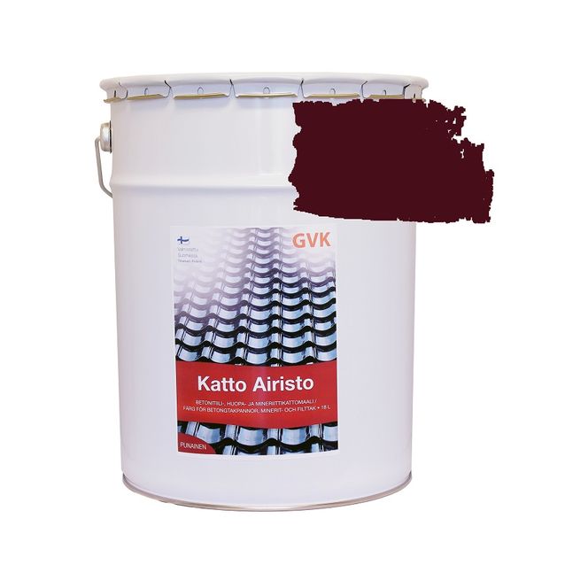 Punainen GVK:n Katto Airisto -ulkokattomaali on vesiohenteinen akrylaattipohjainen kattomaali, joka sopii mineriitti- ja betonitiilikatoille, niin uusille kuin vanhoille pinnoille. Tuotteen pakkauskoko on 18 litraa ja maalin riittoisuus on pohjan karkeudesta riippuen 3-8 m²/l.