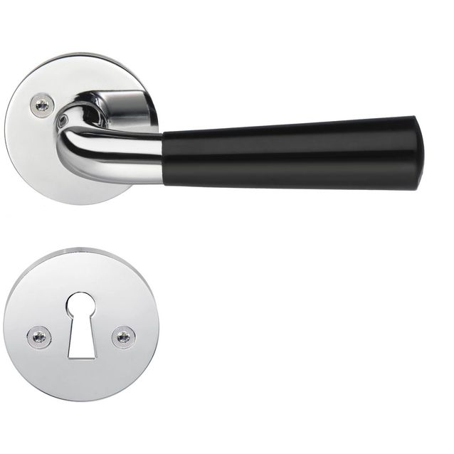 Väliovenpainike Beslagsboden Design B875KN kiillotettu kromi/musta bakeliitti. Tuotteen toimitukseen sisältyy painikepari kiinteät peitelevyt, avainkilvet ja läpikiinnitysruuvit.