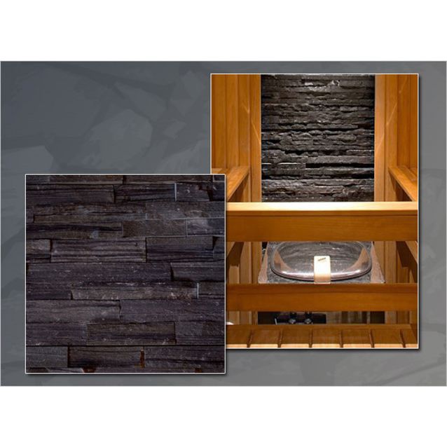 Verhoilukivi Shanghai Pippuri on näyttävän näköinen, mustanharmaista 2-4 cm vahvoista lohkoreunakivistä koottu 60x15 cm kivielementti. Elementeillä saat luotua upean näköistä seinää esim. kiukaan taakse. Fylliittiliuskekivi voi jatkuvassa kosteudessa muuttaa hivenen väriä.