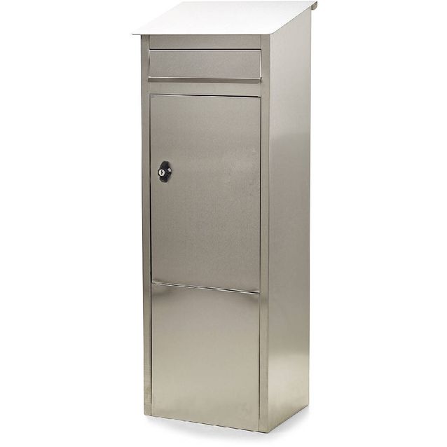 Lukittava postilaatikko jauhemaalattua alumiinia teräksen värisenä. Sisältää 2 avainta. Voidaan käyttää myös lukitsematta. Helppo muuttaa viikkopostilaatikoksi irrotettavan välipohjan ansiosta. Mukana jalat/tolpat sekä valulaatta. Korkeus 1 m. Postiluukun koko 295 x 52 mm.