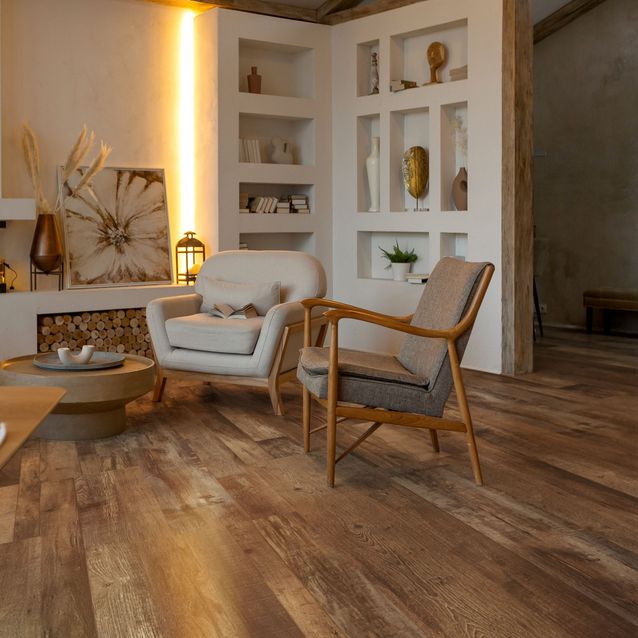 Laadukas Concept Floor Profiline Old Wood Mocca on näyttävä, tummanruskea vinyylilankku, joka on varustettu valmiiksi integroidulla alusmateriaalilla. Lattiassa on vanhan, kuluneen puulattian ulkonäköä muistuttava reilun rustiikkinen, vaihtelevasauvainen kuosi. Lankun kuvioinnista löytyy niin oksia, halkeamia kuin hankautumiakin. Rustiikkinen kuosi on erityisen hyvä valinta tilaan, jonne kulkeutuu kengistä likaa, sillä tästä kuosista ei ihan pientä tahraa erota. Lankun pinnassa tuntuu lisäksi miellyttävä puunsyykuviointi. Old Wood Mocca -lankut ovat viisteteettömiä, eli lankkujen saumat ovat tasaiset.