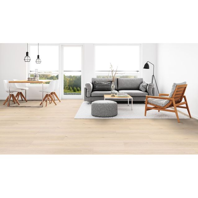 Tarkett iD Inspiration Click Solid 55 Highland Oak Cream on kauniinvaalea vinyylilankku, jonka mitat ovat 190,5 mm x 1211 mm. iD Inspiration Click Solid 55 -vinyylilattia soveltuu käytettäväksi yhdessä lattialämmityksen kanssa. Tuote parantaa akustiikkaa: kun iD Inspiration Click Solid 55:n alle laitetaan Tarkettin alusmateriaali Tarkomfort Premium, saadaan askeläänen vaimennusarvoksi 18 dB (askelääni tarkoittaa alempaan kerrokseen kuuluvaa ääntä). Lattian etuja ovat myös ftalaatittomuus, alhaiset päästöt ja M1-hyväksyntä. Lattia on valmistettu Euroopassa.